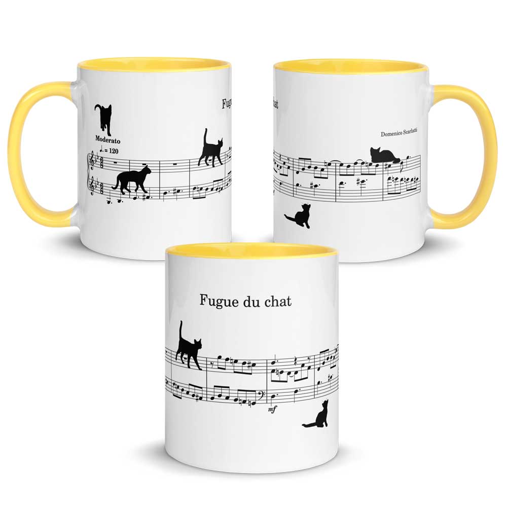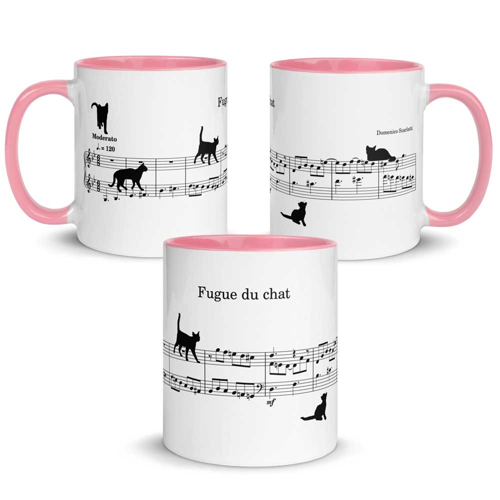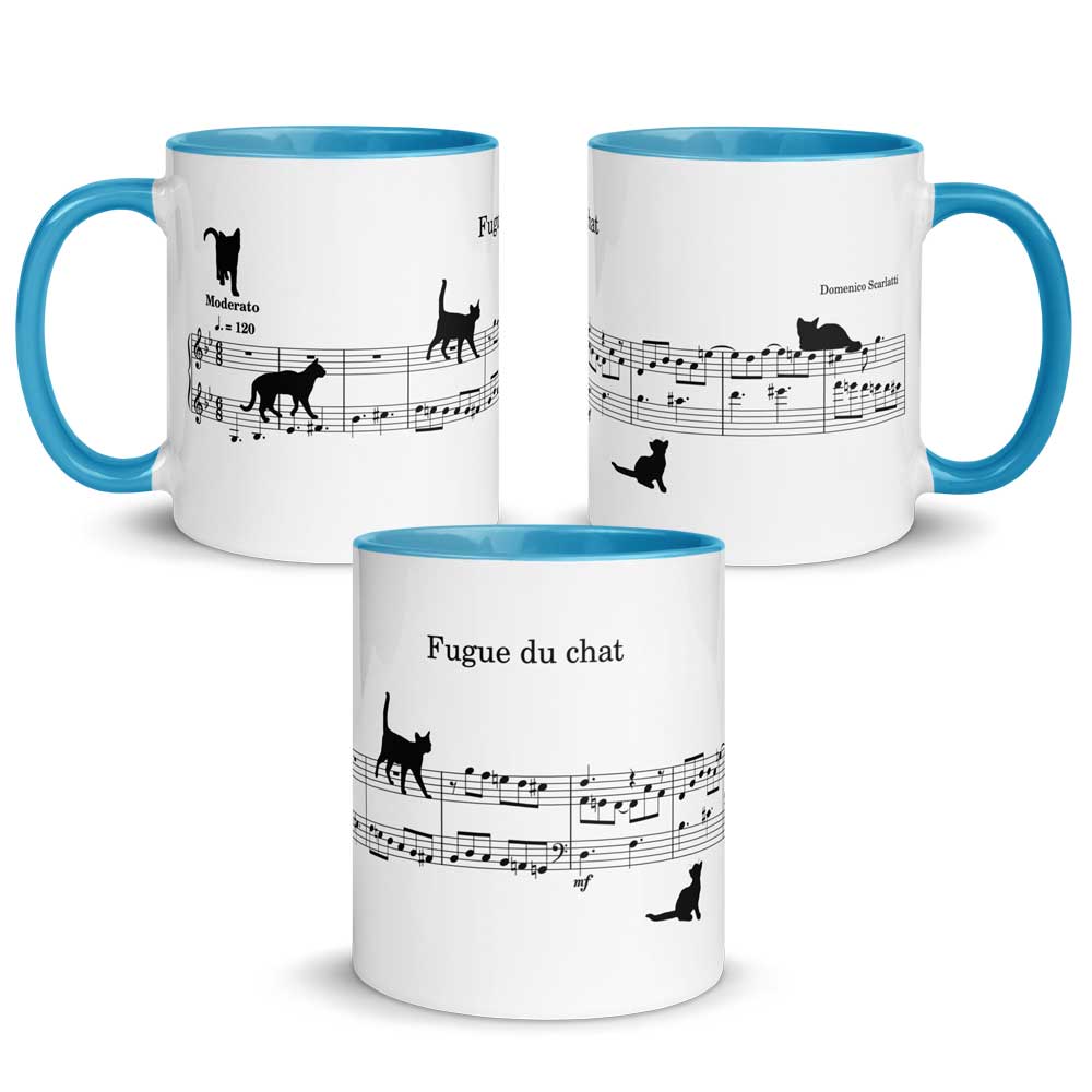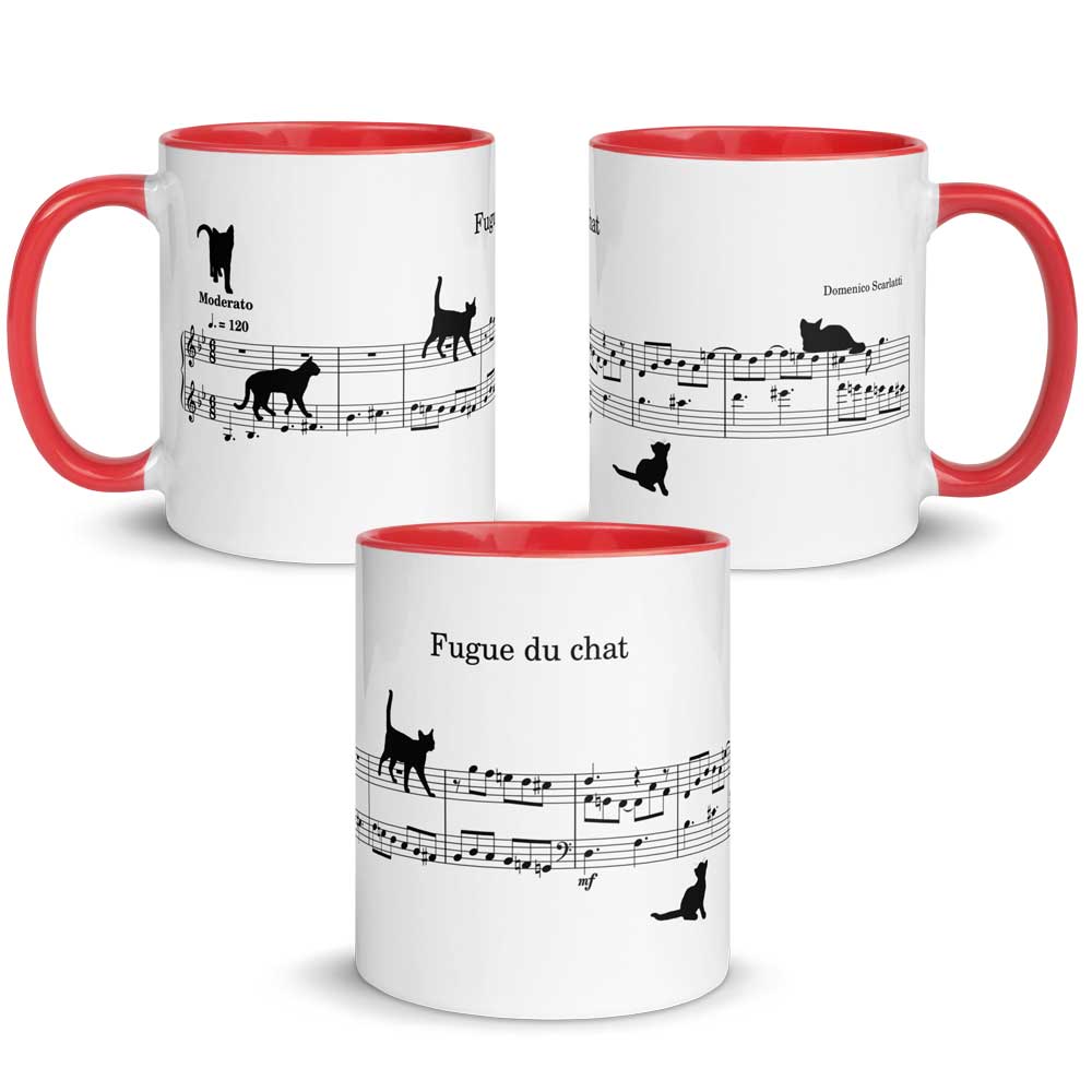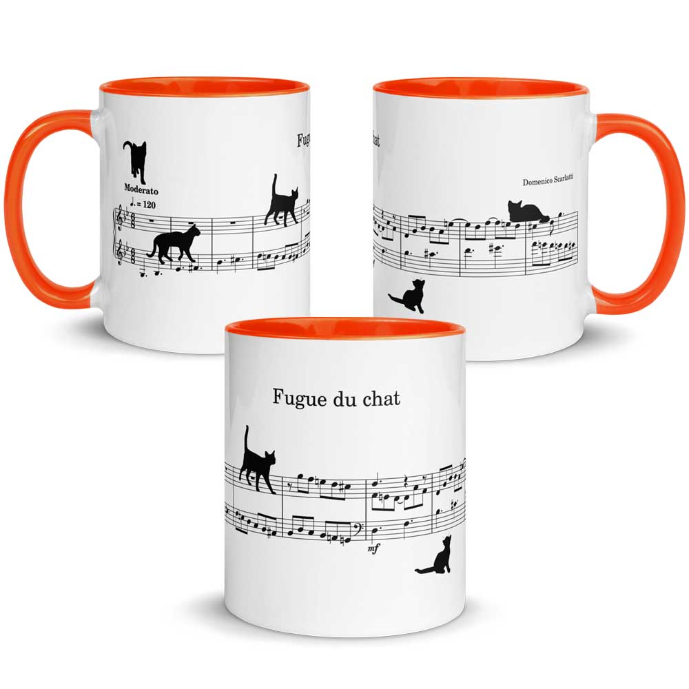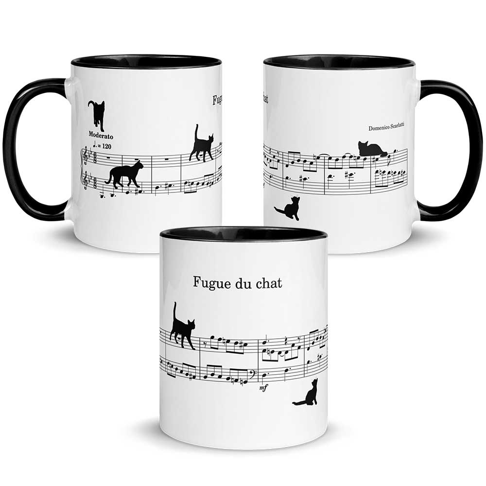Vous avez déjà peut-être entendu parler de la Fugue de chat de Domenico Scarlatti (18ème siècle). Ou même, vous l’avez déjà peut-être interprétée ! Dans ce cas, vous en reconnaitrez immédiatement les 9 premières mesures qui se trouvent sur ce mug. Car il s’agit bien d’une partition exacte. A la différence près que quelques chats se baladent dans la portée… Le premier, en haut et à gauche, vous annonce le tempo de l’œuvre, à savoir « Moderato ». Le deuxième marche nonchalamment sur le motif de la fugue qui démarre tranquillement en noires pointées puis redescend tout en croches. Quant au dernier, il est déjà un peu fatigué (vous connaissez les chats, n’est-ce pas !). Alors il se repose sans aucune gêne sur le dessus de la portée 😉