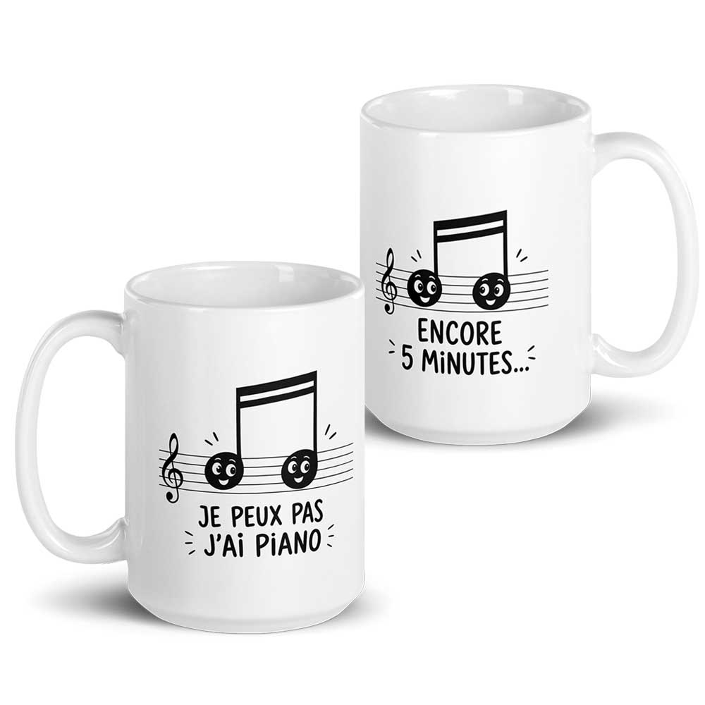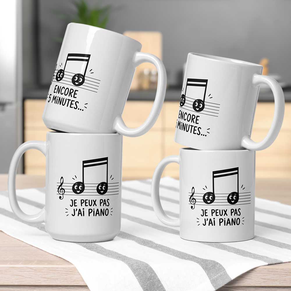 Mug humour « Notes de musique » hyper mignonnes avec des messages complémentaires adaptés aux fans de piano : « Je peux pas j’ai piano » et « Encore 5 minutes… ».
